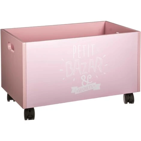 Box in legno con rotelle ideato come cesta per riporre i giocattoli dei bambini, dimensioni 48 x 28 x 28,5 centimetri.
