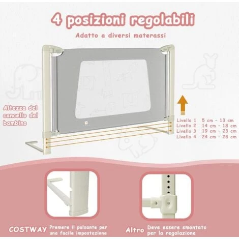 Sbarra di sicurezza per bambini: Con un design senza cuciture, questa sbarra è certificata così i bambini non cadranno dal letto quando si girano e i genitori potranno dormire tranquilli sapendo che i figli sono al sicuro. La doppia chiusura di sicurezza evita che il bambino apra accidentalmente la sbarra.
