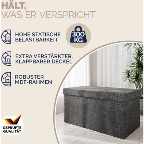 La cassapanca è realizzata in robusto MDF. Il coperchio può essere aperto da entrambi i lati, in modo da poter estrarre o inserire rapidamente e facilmente gli oggetti senza dover togliere l’intero coperchio.