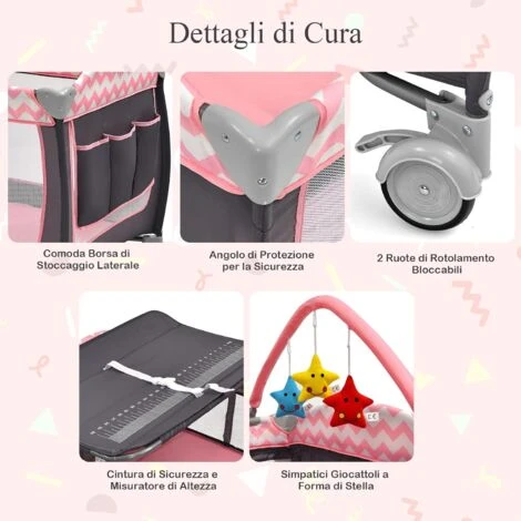 - Struttura Stabile e Libertà di Movimento: La struttura di supporto a 7 punti in tubo metallico sul fondo migliora la stabilità complessiva. Inoltre, le 2 ruote con freno consentono ai genitori di spostare il box da una stanza all’altra.