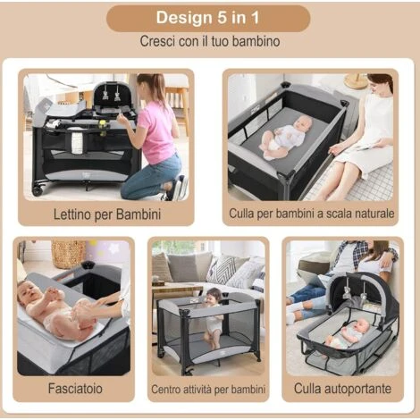 - 5-in-1 Culla da Campeggio: Questo lettino combina 5 modalità in un’unica unità, tra cui il lettino bambino, la culla a grandezza naturale, la culla utilizzabile separatamente, il fasciatoio e il box bambini.