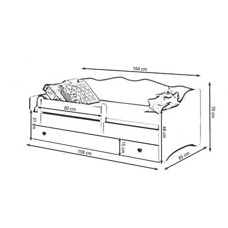CARATTERISTICHE TECNICHE – Costruito interamente in pannello truciolare melaminico e rifinito in laminato risulta resistente e urti e graffi, ed è durevole nel tempo – Pulizia facile e veloce grazie al materiale di cui è composto – Spessore Pannello 1,8 cm – Misure letto in cm: 164x85h70 – Materasso incluso da 80x160h7 cm – Cassettone: 80x160h15 cm – Protezione anticaduta: 80 cm