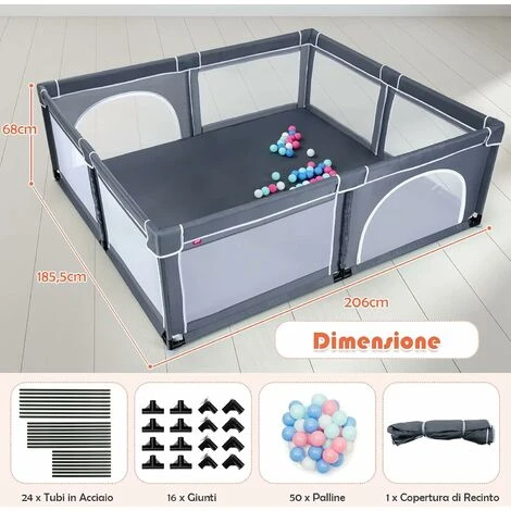 - Centro di Attività Sicuro e Divertente – Questo box rettangolare per bambini offre un ampio spazio per giocare con la misura di 206 x 185,5 x 68 cm. Sarà un centro di attività sufficiente per far giocare 2 o 3 bambini insieme, i bambini possono camminare, correre e gattonare. Inoltre, forniamo 50 palline colorate per divertirsi.