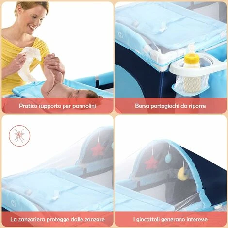 - Varie Configurazioni – materasso, telaio per pannolini, cremagliera, borsa giocattolo, zanzariera, tre giocattoli. La configurazione è completa.
