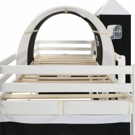 Questo letto a soppalco per bambini a tema pirata sarà una vera e propria attrazione nella camera da letto del vostro bambino. Il letto a soppalco ha una costruzione solida e viene consegnato con le doghe del letto, uno scivolo, una scala e una tenda a tema pirata, copertine laterali e un baldacchino. Le barriere di sicurezza su entrambi i lati del letto manterranno il vostro piccolo pirata nel suo letto a soppalco. Lo spazio sotto il letto si trasforma nella sede del capitano con le pareti laterali con finestre incluse. Il letto a soppalco è caratterizzato da divertenti accessori, uno scivolo e una scala, che possono essere riparati dalla copertura in dotazione. Lo scivolo e la scala possono essere montati sia sul lato sinistro che su quello destro, ed è inoltre incluso un baldacchino per il letto. Il letto è adatto a materassi di dimensioni 90 x 200 cm. Il vostro bambino amerà dormire e giocare nella sua fortezza da pirata personale! Si prega di notare che il materasso non è incluso in consegna.