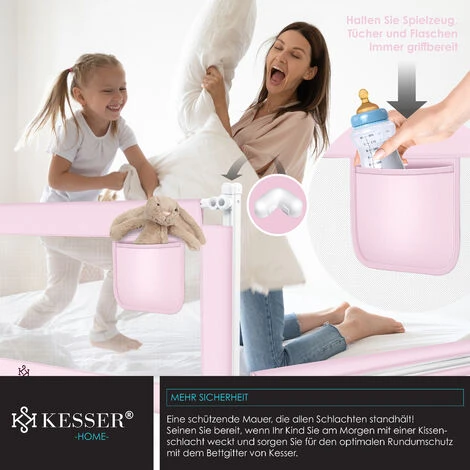 Una barriera protettiva che resiste a tutte le battaglie ! Sarai tranquillo quando il tuobambino ti sveglierà al mattino con una battaglia di cuscini e avrai la protezione ottimale con la barriera di sicurezza del marchio KESSER. Dettagli speciali , come ad esempio le tasche integrate , forniscono ulteriore spazio per riporre giocattoli, salviette e bottiglie. Un altro grande vantaggio della sponda del lettoKESSER è la funzione aggiuntiva di sicuro box recintato, in cui i tuoi bambini possono giocare con tanto divertimento. Potrai combinare quattro sponde del letto del marchio KESSER e collegarle molto semplicemente con gli elementi di collegamento inclusi in dotazione.