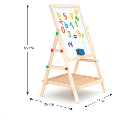 I giocattoli realizzati con la metodologia Montessori Robincool favoriscono lo sviluppo cognitivo e psicomotorio dei bambini. Favoriscono la creatività, incoraggiano la concentrazione e aumentano la fiducia e l’autostima. Inoltre, sono realizzati con materiali ecologici e facili da maneggiare.nIl gioco di ruolo è fondamentale nello sviluppo dei bambini più piccoli. Con questa lavagna 2 in 1 possono giocare a fare gli insegnanti o imparare a scrivere le loro prime parole. Un lato è fatto di lavagna e l’altro è magnetico, in modo da poter posizionare i numeri a calamita inclusi. Questa lavagna Montessori 2 in 1 è dotata di un ripiano interno che consente di riporre tutti gli accessori contenuti nella confezione.nnCaratteristiche:n- Misure del prodotto: 41x35x65 cm.n- Peso: 1,4 kg.n- Materiale: legno ecologico.n- Colore: Multicolore.n- Età: + 3 anni.n- Certificato: CE e EN71.n- Accessori inclusi: gomma, gesso, pennarello e numeri a calamita.