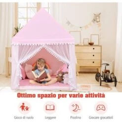 Tenda Da Gioco Casetta Per Bambini, Castello Giocattolo Tenda, Legno Cotone, 120x105x140 Cm (Rosa)