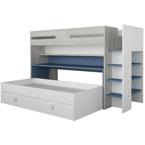 Il letto a castello bianco celeste è composto da due letti, una scrivania estraibile, ampi cassetti e ripiani.