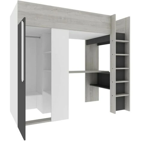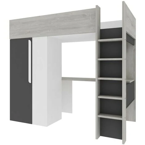 Letto a soppalco Kyle per un bambino Nero grafite Bianco opaco e Rovere con armadio e scrivania