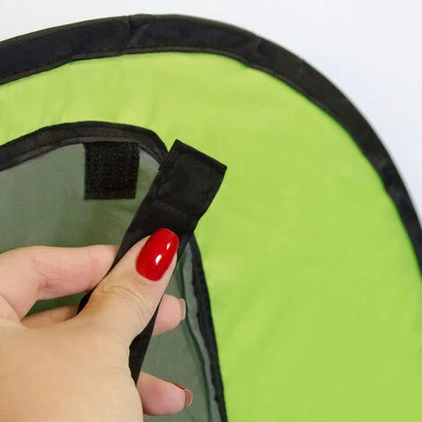 È sufficiente sfilare la tenda dalla custodia e, grazie all’intelaiatura di fildiferro, la tenda si spiega e rimane in piedi da sola. La cornice di acciaio è saldamente cucita: la tenda è priva di spigoli e bordi taglienti – nessun rischio di farsi male!