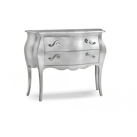Stile: Comò bombato in arte povera con 2 cassetti. Una soluzione ideale per tenere in ordine vestiti e oggetti personali. La superficie ampia e luminosa potrà accogliere i tuoi soprammobili e darà uno stile classico e curato all’ambiente – Colorazione: Argento – Materiale di costruzione: Struttura in legno di Pioppo – Misura: 100x42x85h – Mar.c.a. Design: Arredi e Design di alta qualità, con esperienza ed assistenza post vendita