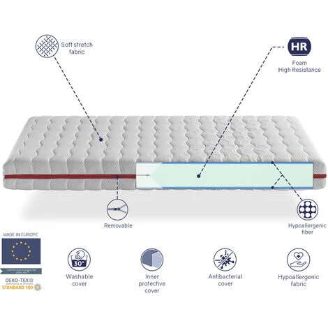 - Materasso sfoderabile. Ha due coperture. Il rivestimento esterno è realizzato in tessuto elasticizzato morbido ed elastico. La fodera interna è realizzata in tessuto protettivo multielastico per facilitare la rimozione e proteggere il nucleo del nostro bambino.