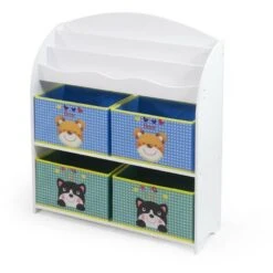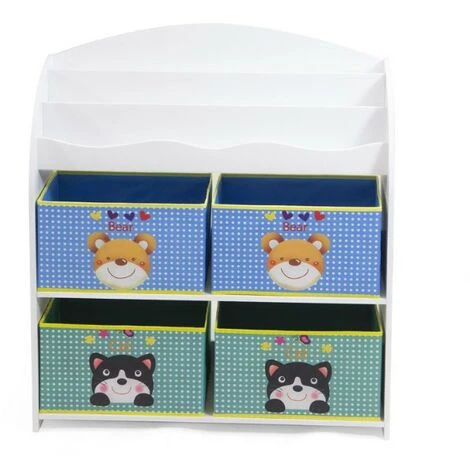 I tre vani e le quattro capienti ceste illustrate consentono di tenere in ordine di tutto, come riviste, libri, peluche e giocattoli; la struttura in legno MDF garantisce robustezza e stabilità e gli angoli arrotondati garantiscono protezione da eventuali urti accidentali.