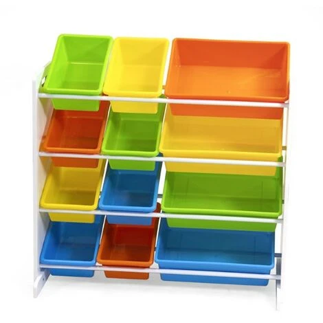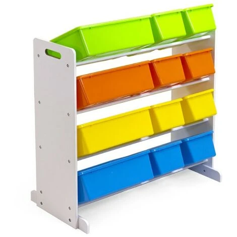 I 12 cestoni colorati in due differenti misure, posizionati su 4 piani, consentono di tenere in ordine di tutto, come libri, peluche e giocattoli; la struttura in legno MDF e le barre di supporto alla base garantiscono robustezza e stabilità allo scaffale.