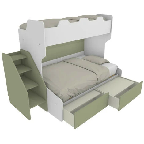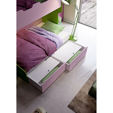 Letto a castello con letto inferiore a una piazza e mezza 120×190, con scaletta indipendente e posizionabile sia a destra che a sinistra. Opzionale possibilità di mettere il terzo letto estraibile o i cassettoni. Se i colori caricati non ti piacciono contattaci per averne degli altri