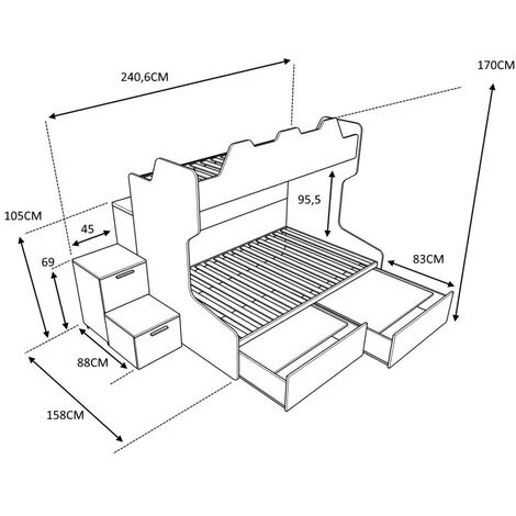 Letto a castello con gradinata a 2 cassetti con chiusura rallentata,posizionabile sia a destra che a sinistra. Passerella retro letto uso camminatoio per facilitare l’ingresso dei bambini e il rifacimento delle coperte sul letto superiore. Reti strutturali in acciaio con profilo 40×30 mm, 12 doghe in legno di faggio. Ogni rete ha una portata di 120kg. Rete superiore per materasso 80×190, rete inferiore per materasso 120×190. Altezza consigliata dei materassi 18 cm. Il prodotto si monta in 20 minuti con 1 cacciavite (Guarda il tutorial su youtube). Il prodotto viaggia su bancale parzialmente montato. Dopo che il bancale viene scaricato dal corriere piano strada, aprite il bancale e prendete i singoli colli per entrarli dentro casa (entrano anche in ascensore).