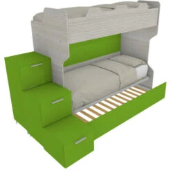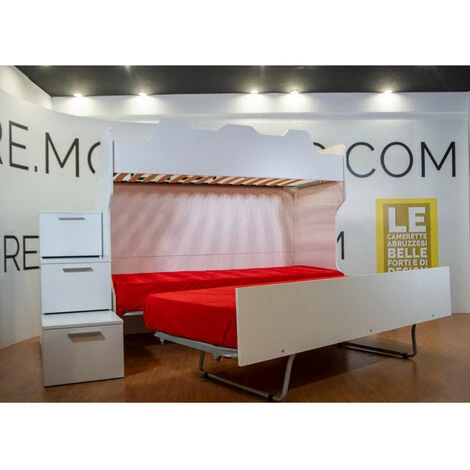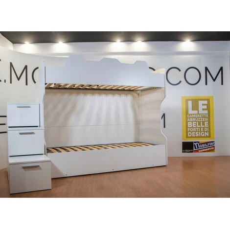 Letto a castello con scaletta indipendente con 3 cassetti a chiusura rallentata, posizionabile sia a destra che a sinistra. Reti strutturali in acciaio con profilo 40×30, 12 doghe in legno di faggio. Ogni rete ha una portata di 120kg. Materasso consigliato 80×190 h 18 .Il prodotto si monta in 20 minuti con 1 cacciavite (Guarda il tutorial su youtube). La merce viaggia su bancale parzialmente montata. Una volta scaricati dal corriere tutti i colli entrano facilmente in ascensore. Versioni disponibili con cassettoni estraibili chiusi con coperchio ed indipendenti, oppure con terzo letto estraibile sollevabile indipendente a formare un matrimoniale