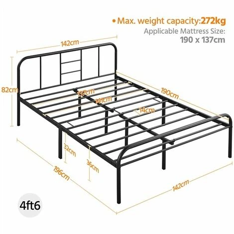 ✔️ Letto matrimoniale standard: le dimensioni complessive includono una larghezza di 142 cm, lunghezza di 196cm e altezza di 82 cm. Questa struttura in metallo è progettata per adattarsi alle misure standard dei materassi matrimoniali, a prescindere dalle tipologie come memory foam, lattice, ibridi o a molle.